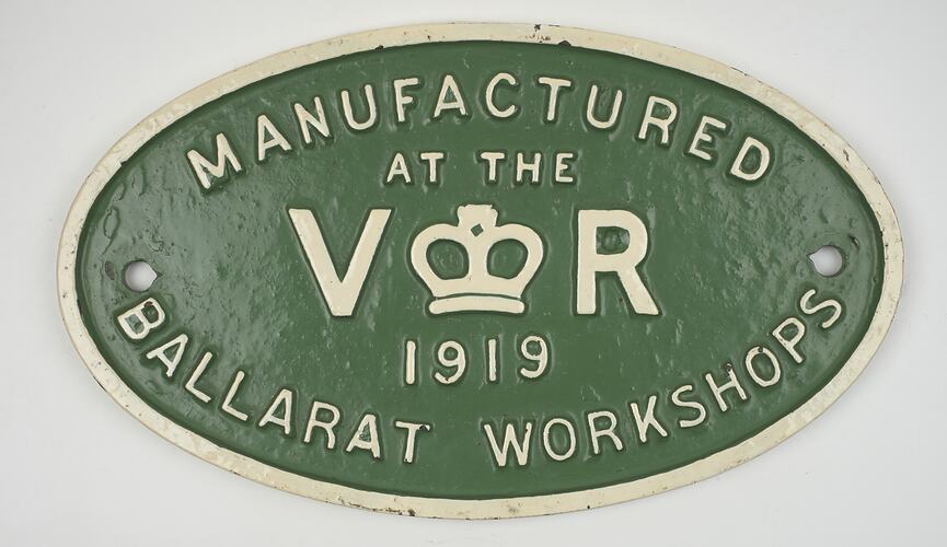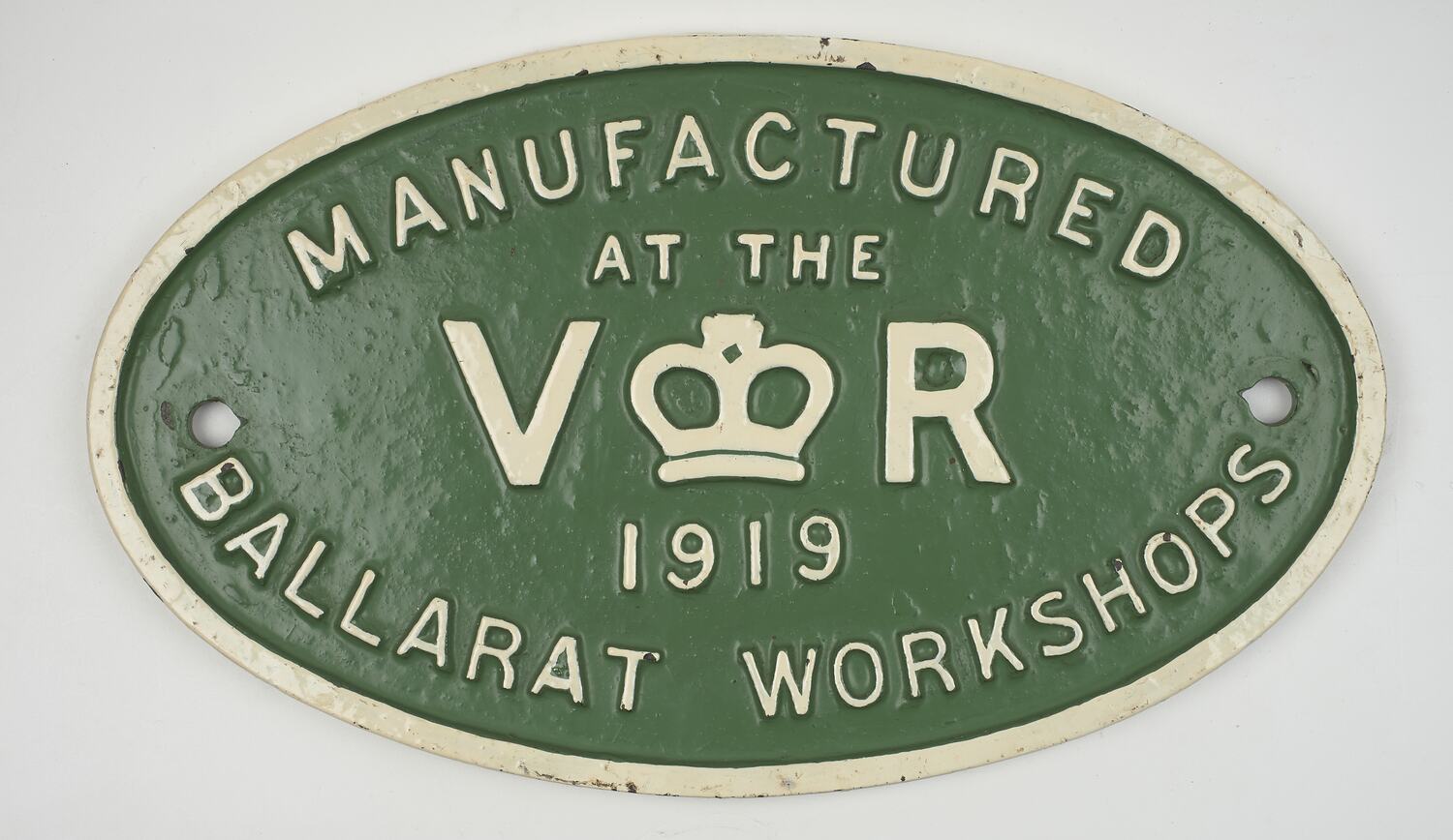 Cast iron oval locomotive builders plate, manufactured by Victorian Railways, Ballarat Workshops, 1919.