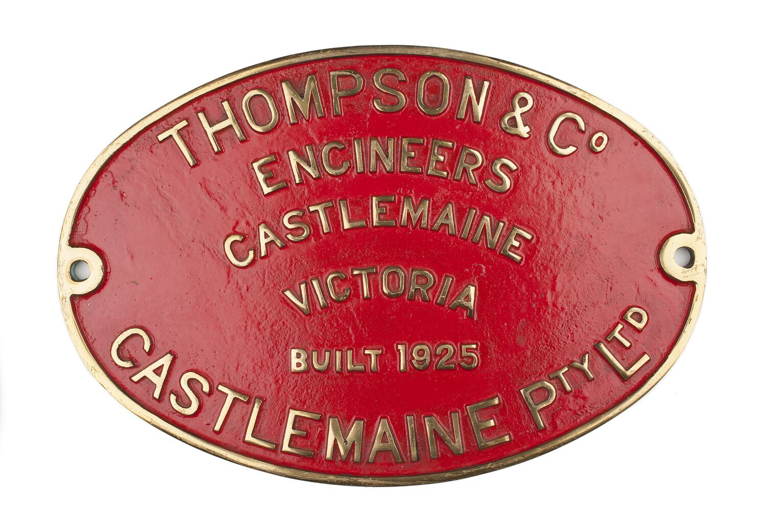 Brass oval locomotive builders plate, manufactured by Thompson & Co. (Castlemaine) Pty Ltd, Castlemaine, Victoria, 1925.