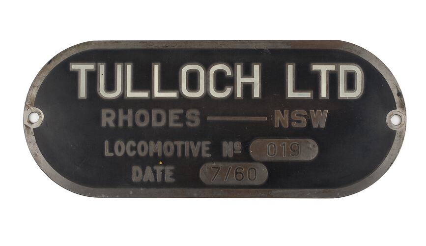 Aluminium rectangular locomotive builders plate, No. 019, manufactured by Tulloch Ltd, Rhodes, New South Wales, July 1960.
