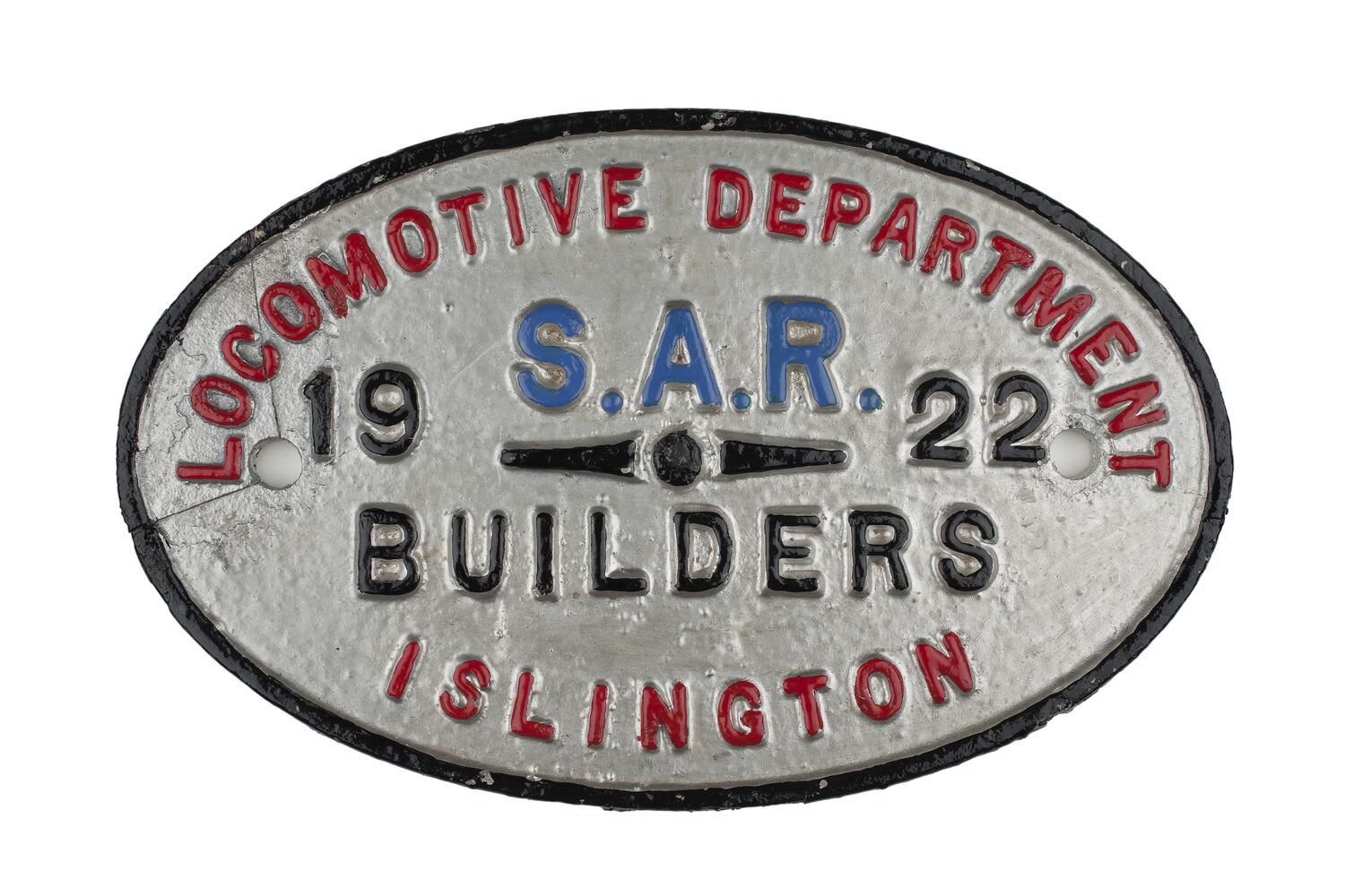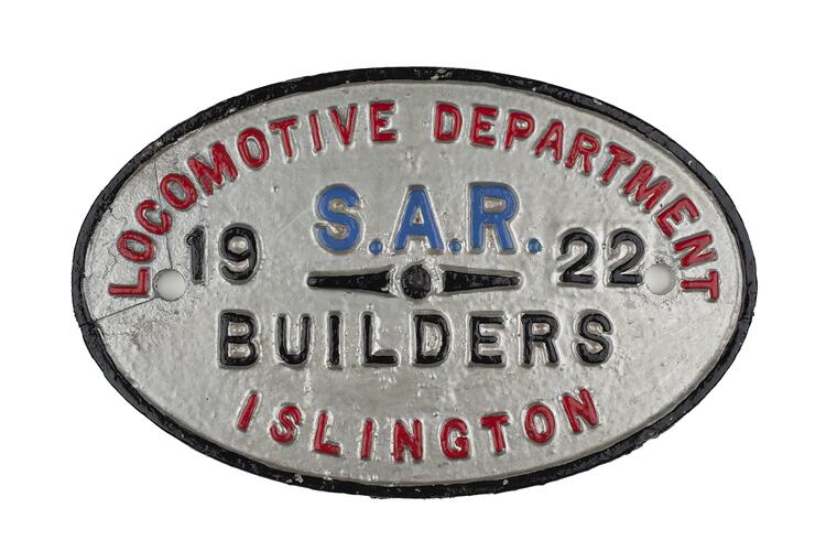 Builders plate from a locomotive built by Locomotive Department of the South Australian Railways, Islington Works, 1922.