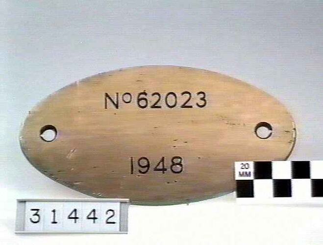 Brass oval locomotive builders plate, No. 62023, manufactured by London & North Eastern Railway, England, 1948.