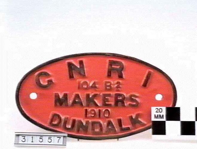Brass oval locomotive builders plate, No. 104B2, manufactured by Great Northern Railway (Ireland), Dundalk Works, Ireland in 1910.
