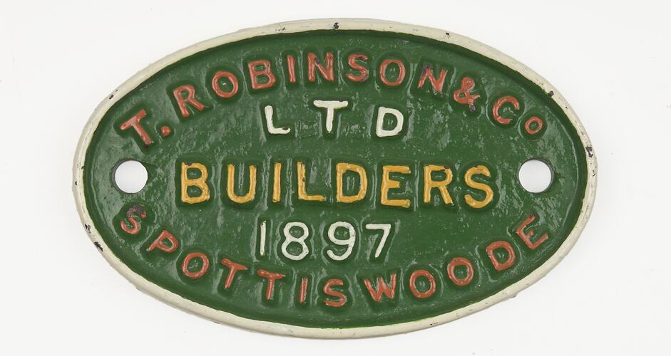 Builders plate for railway rollingstock, made by T. Robinson & Co., Spottiswoode (Spotswood), Victoria, 1897. The plate is believed to come from a louvred goods wagon; the Robinson Co. made 75 ten-ton U Class louvred goods wagons during 1896-1897.