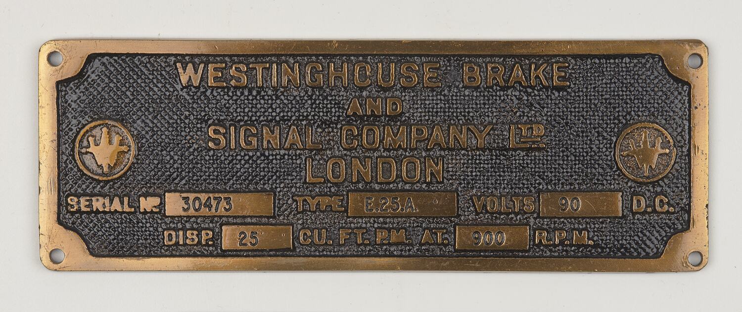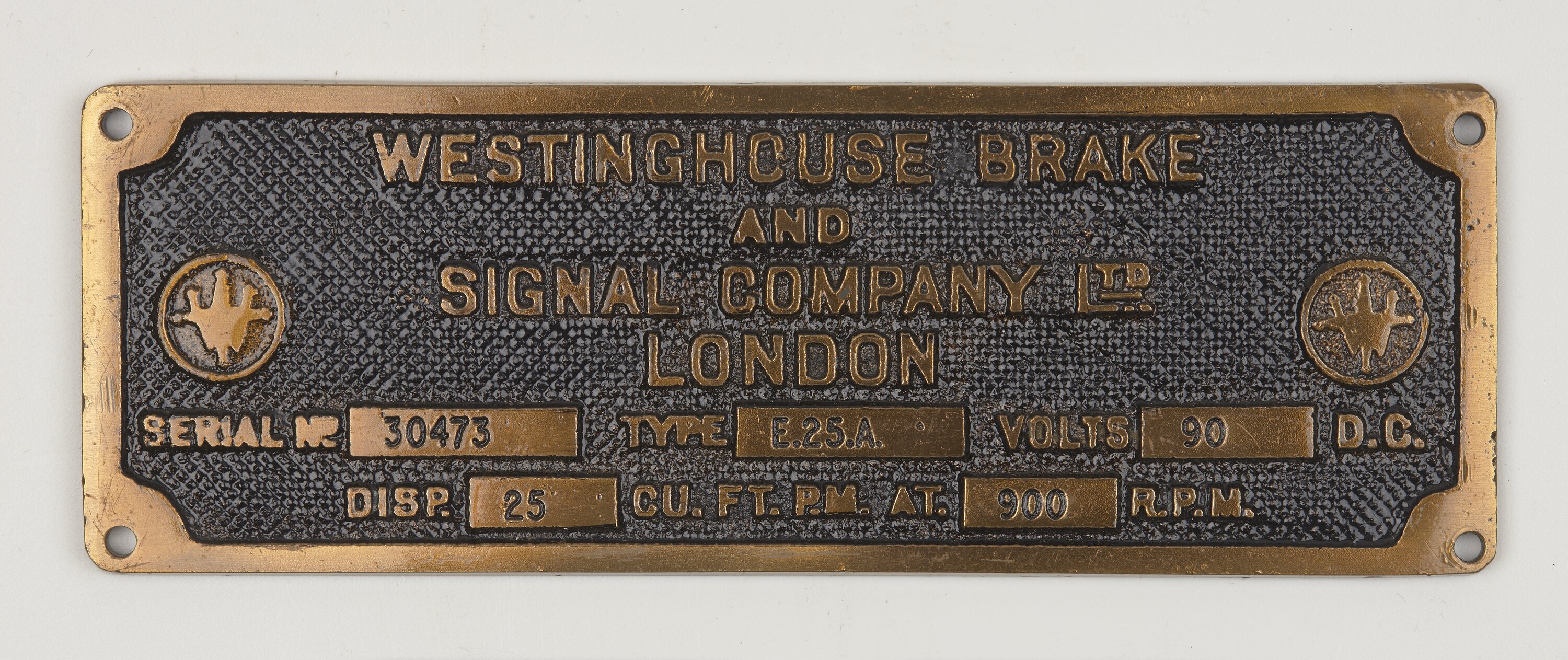 Manufacturers plate from a 'F' air brake compressor, Westinghouse Brake and Signal Company Ltd, London.. Used on Victorian Railways.