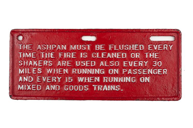 Steam locomotive plate instructing the frequency of flushing the ashpan. From a Victorian Railways steam locomotive.