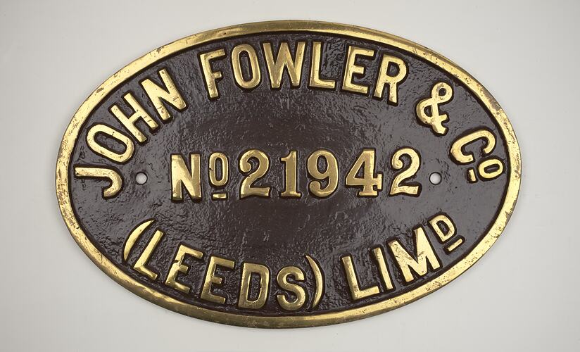 Brass oval locomotive builders plate, No. 21942, manufactured by John Fowler & Co., (Leeds) Ltd., Leeds, England, 1937.