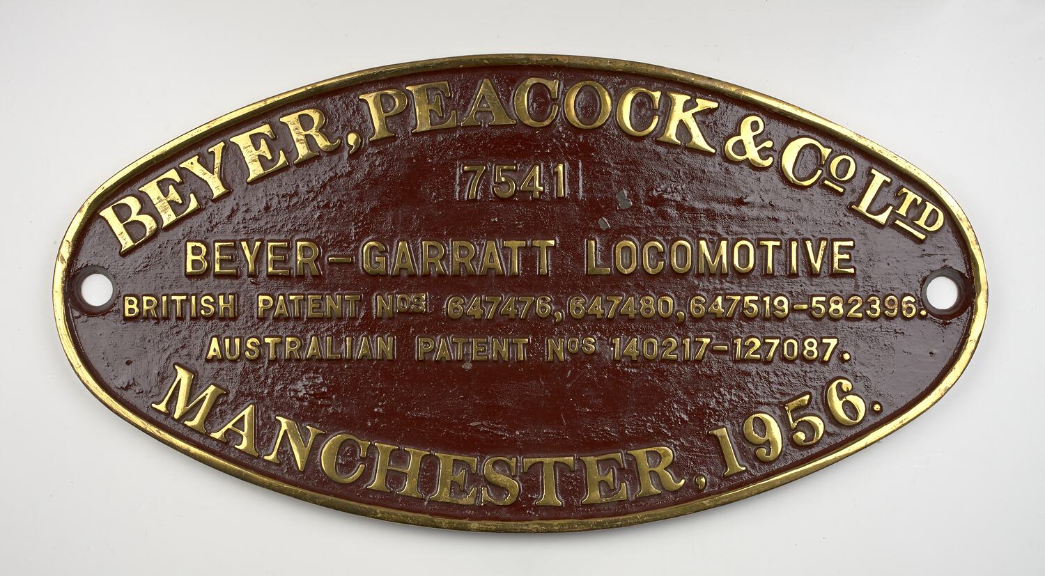 Brass rectangular locomotive plate, Beyer-Garratt Locomotive, 7541, manufactured by Beyer Peacock & Co. Ltd., Manchester in 1956.