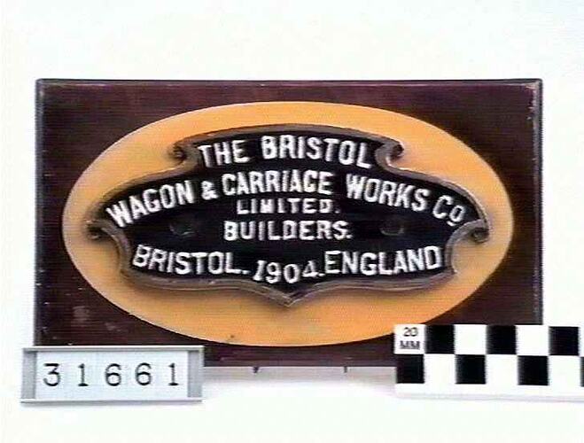 Cast iron rectangular locomotive builders plate, manufactured by Bristol Carriage & Wagon Works, England in 1904.