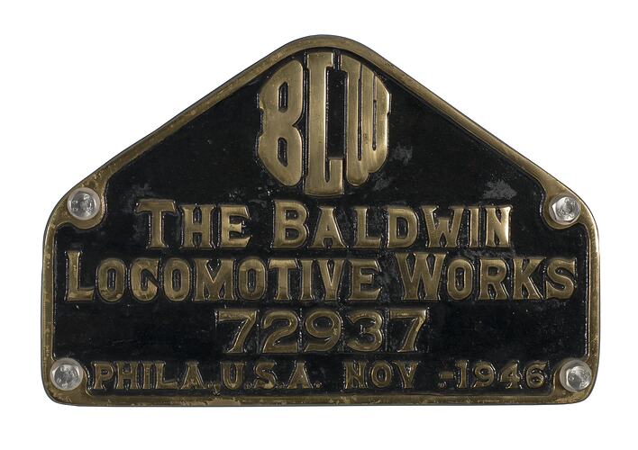 Brass pentagonal locomotive builders plate, No. 72937, manufactured by the Baldwin Locomotive Works, Philadelphia in November 1946.