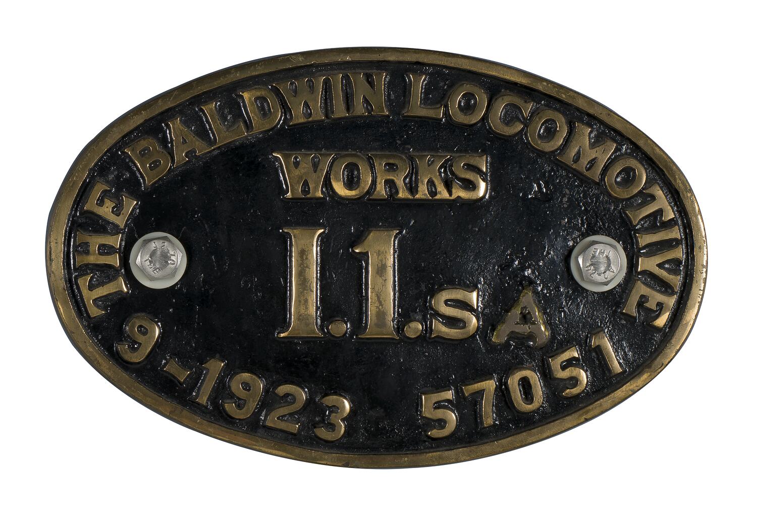 Brass oval locomotive builders plate, No. 57051, manufactured by the Baldwin Locomotive Works, Philadelphia in September 1923.