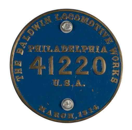 Brass round locomotive builders plate, No. 41220, manufactured by the Baldwin Locomotive Works, Philadelphia in March 1914.