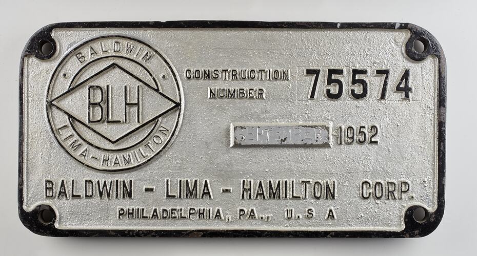 BLH. Baldwin Lima-Hamilton. COnstruction Number 75574. September 1952. Baldwin-Lima-Hamilton Corp. Philadelphia, P.A., U.S.A.
