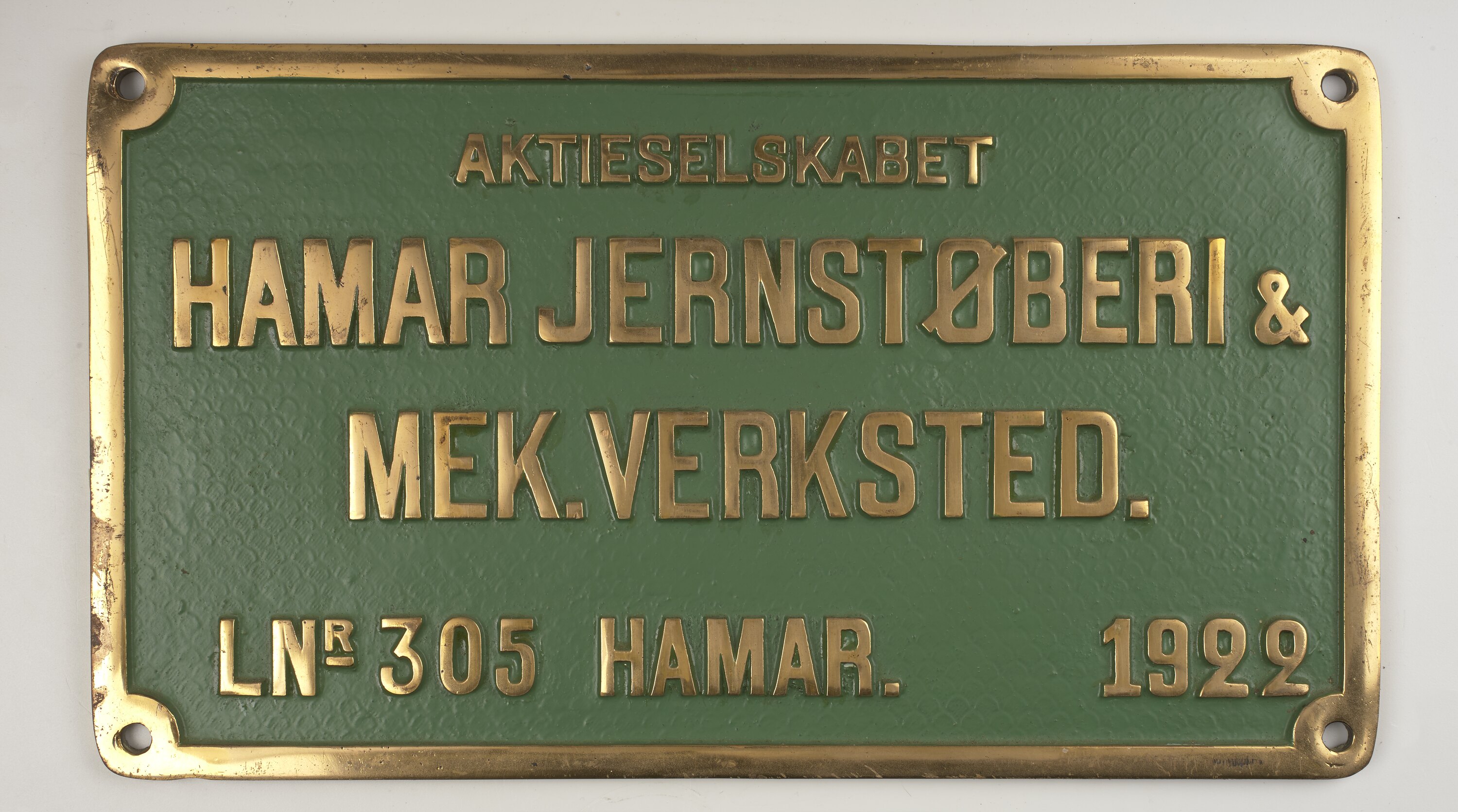 Brass rectangular locomotive builders plate, No. 303, manufactured by Hamar Jernstoberi & Mek Verksted, Hamar, Hedmark, Norway in 1922.