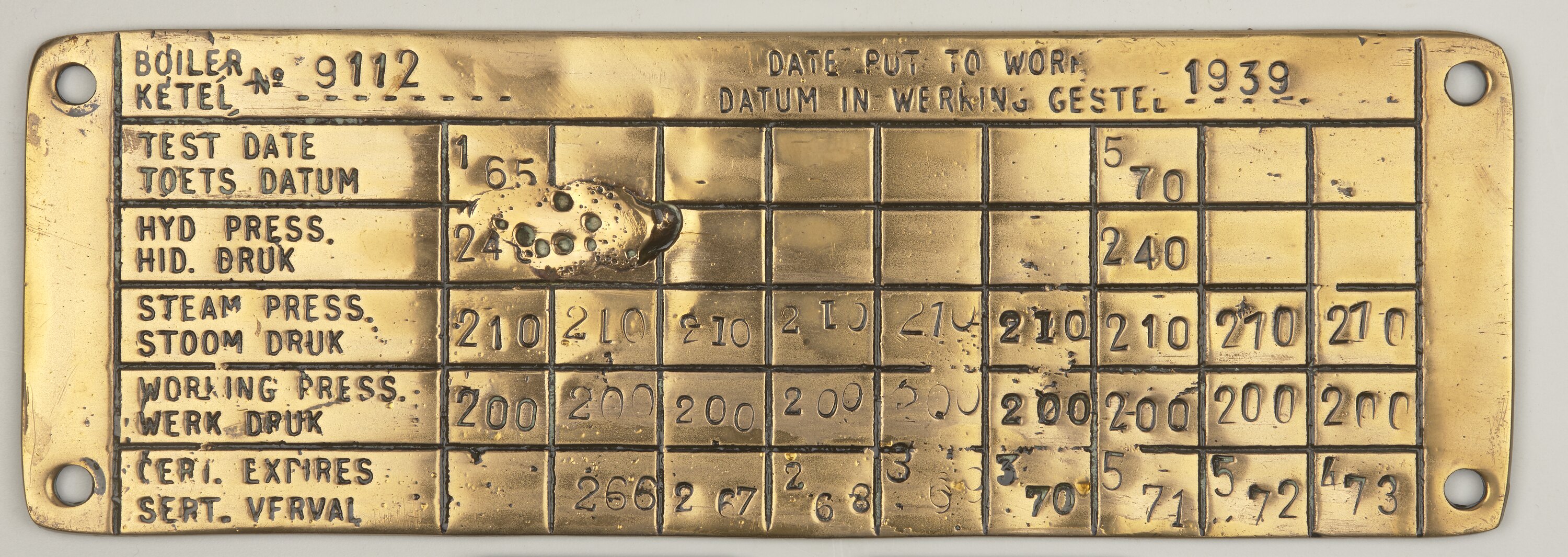 Boiler pressure testing and rebuilding plate, boiler no. 9112, South African Railways, 1939.
