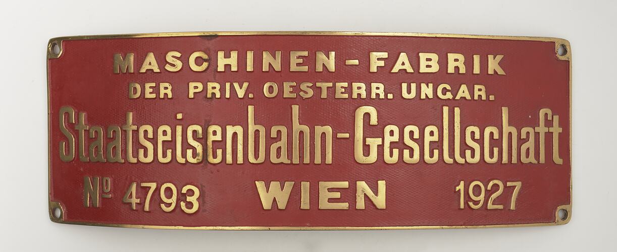 Curved brass rectangular locomotive builders plate, No. 4793, manufactured by SteG (privilegierte österreichisch-ungarische Staatseisenbahn-Gesellschaft), Vienna in 1927.