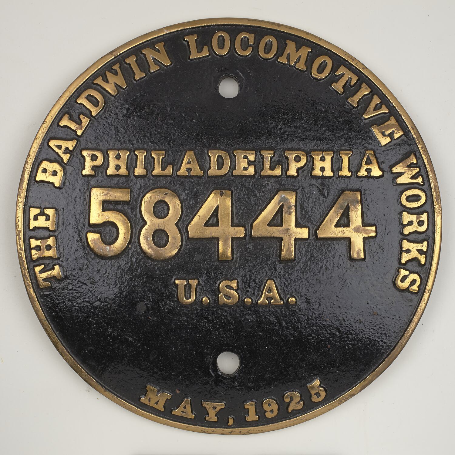 Brass round locomotive builders plate, No. 58444, manufactured by the Baldwin Locomotive Works, Philadelphia in May 1925.