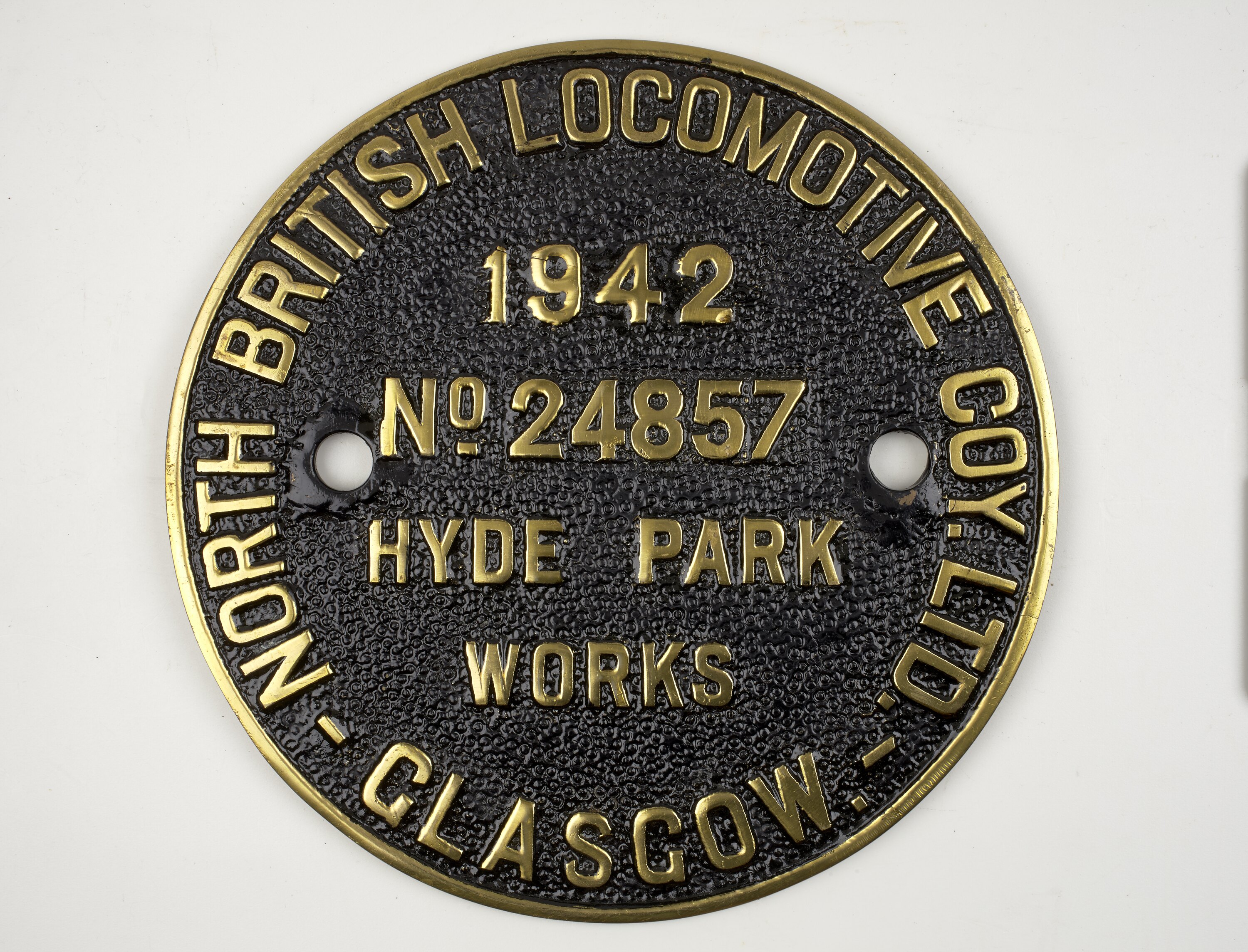 Brass round locomotive builders plate, No. 24857, manufactured by North British Locomotive Co., Hyde Park Works, Glasgow, Scotland, 1942.