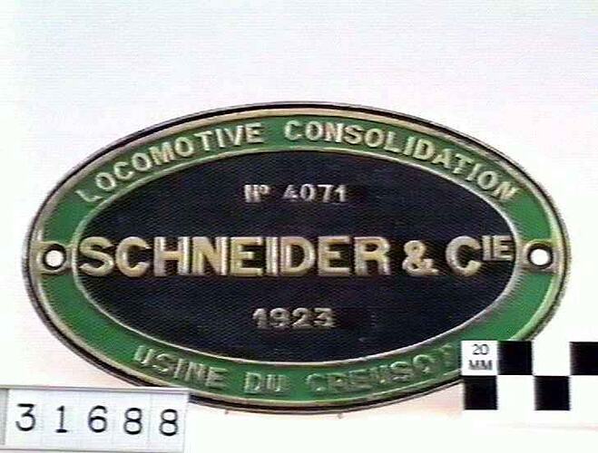 Brass oval locomotive builders plate, No. 4071, manufactured by Schneider & Companie, Paris, France, 1923.