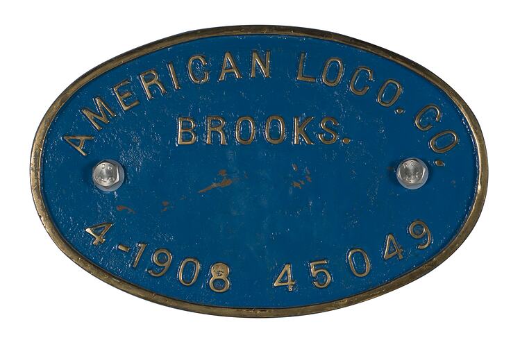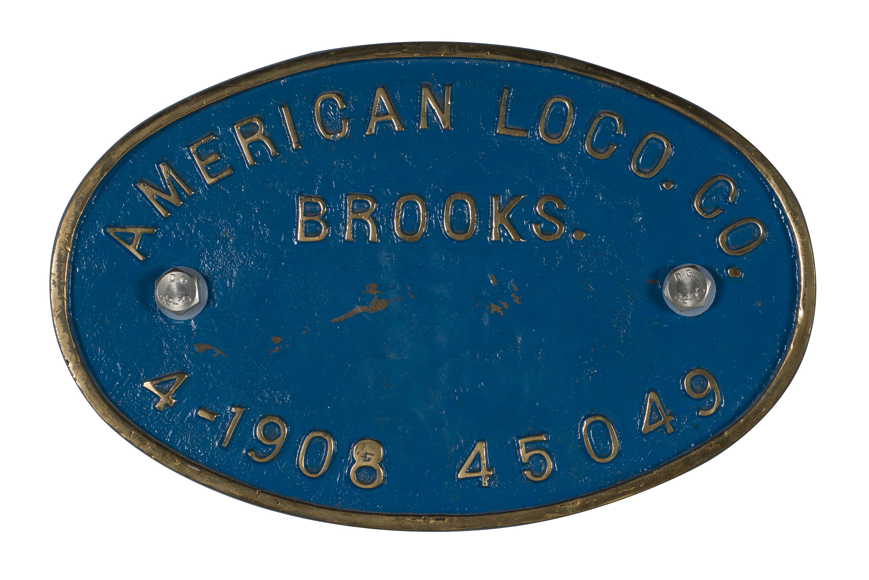 Brass rectangular locomotive builders plate, No. 45049, manufactured by the American Locomotive Company, Brooks Works, Dunkirk, NY in April 1908.