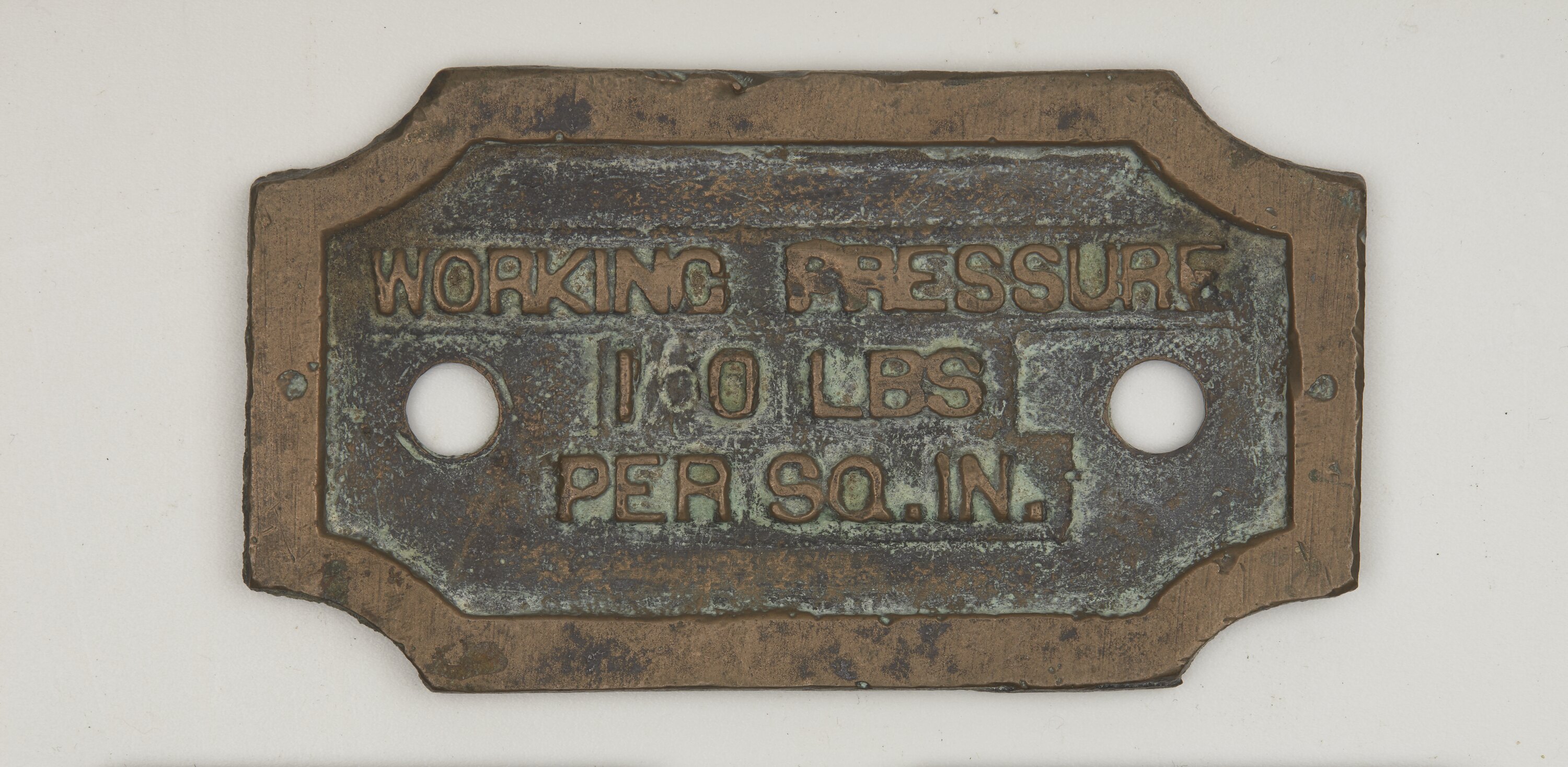 Steam locomotive boiler plate indicating working pressure of 160 pounds per square inch, Queensland Railways.