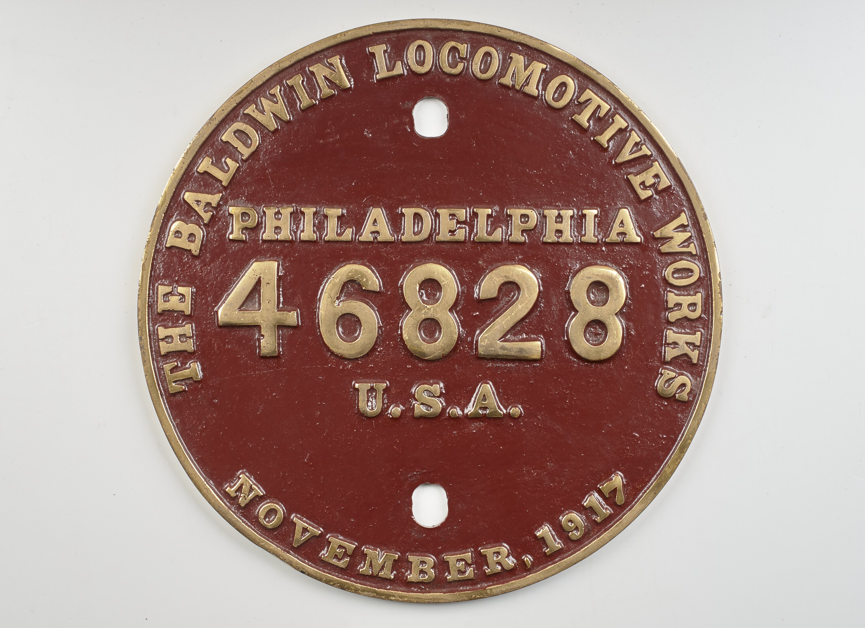Brass round locomotive builders plate, No. 46828, manufactured by the Baldwin Locomotive Works, Philadelphia in November 1917.