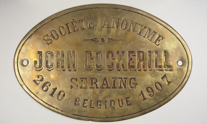 Brass oval locomotive builders plate, No 2610, manufactured by Société Anonyme John Cockerill, Seraing, Belgium, 1907.
