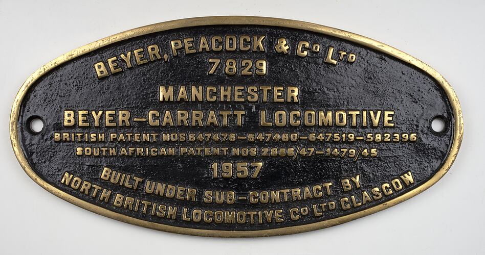 Brass oval locomotive builders plate, No. 7829, manufactured by the North British Locomotive Co., Glasgow under sub-contract for Beyer Peacock & Co. Ltd., Manchester in 1957.