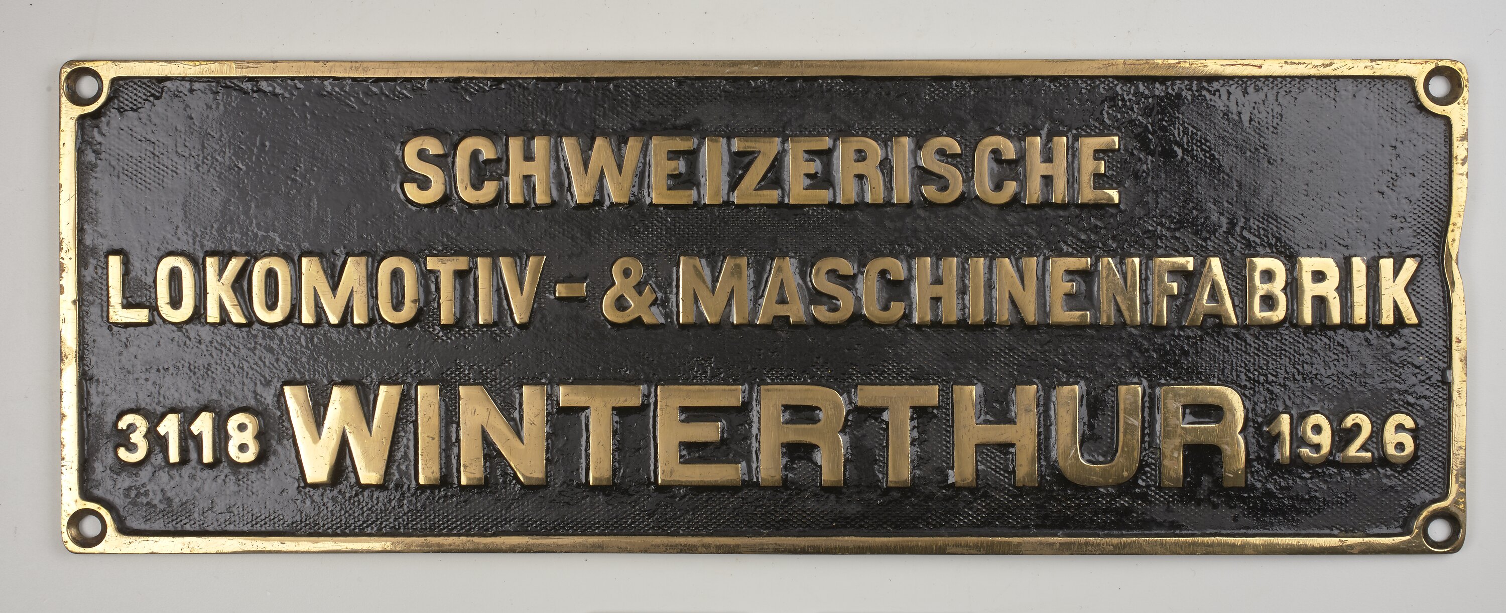 Brass rectangular locomotive builders plate, No. 3118, manufactured by Schweizerische Locomotiv & Maschinenfabrik, Winterthur, Switzerland, 1926.