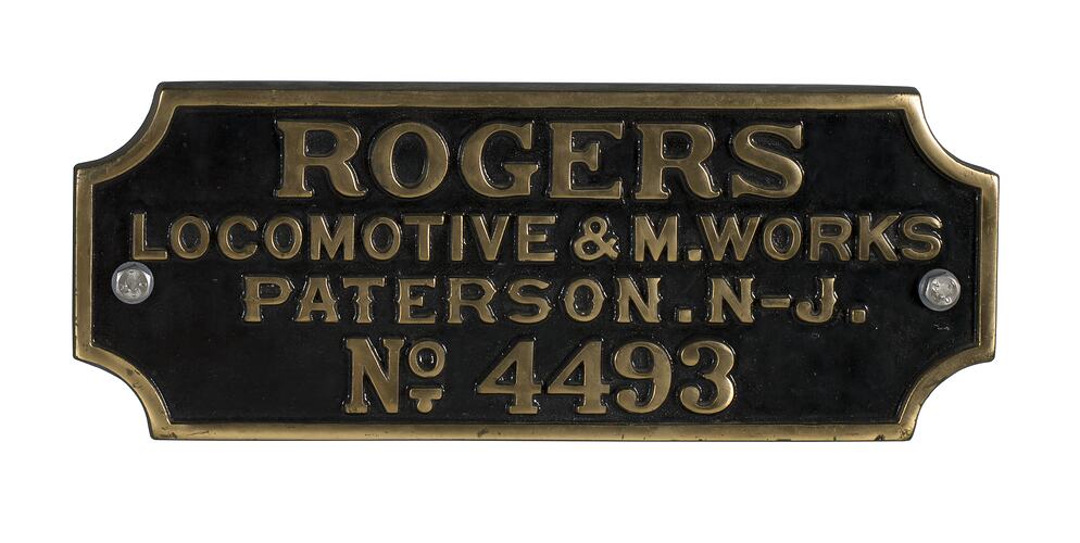 Brass oblong locomotive builders plate, No. 4493, manufactured by Rogers Locomotive & Machine Works, Paterson, New Jersey.