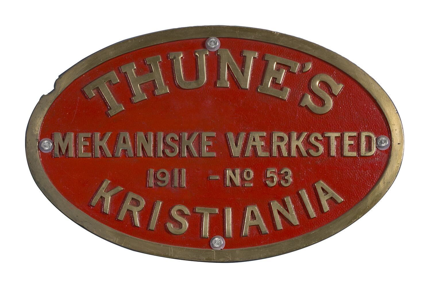 Brass oval locomotive builders plate, No. 53, manufactured by Thunes Mekaniske Vaerksted, Kristiania, Norway, 1911.