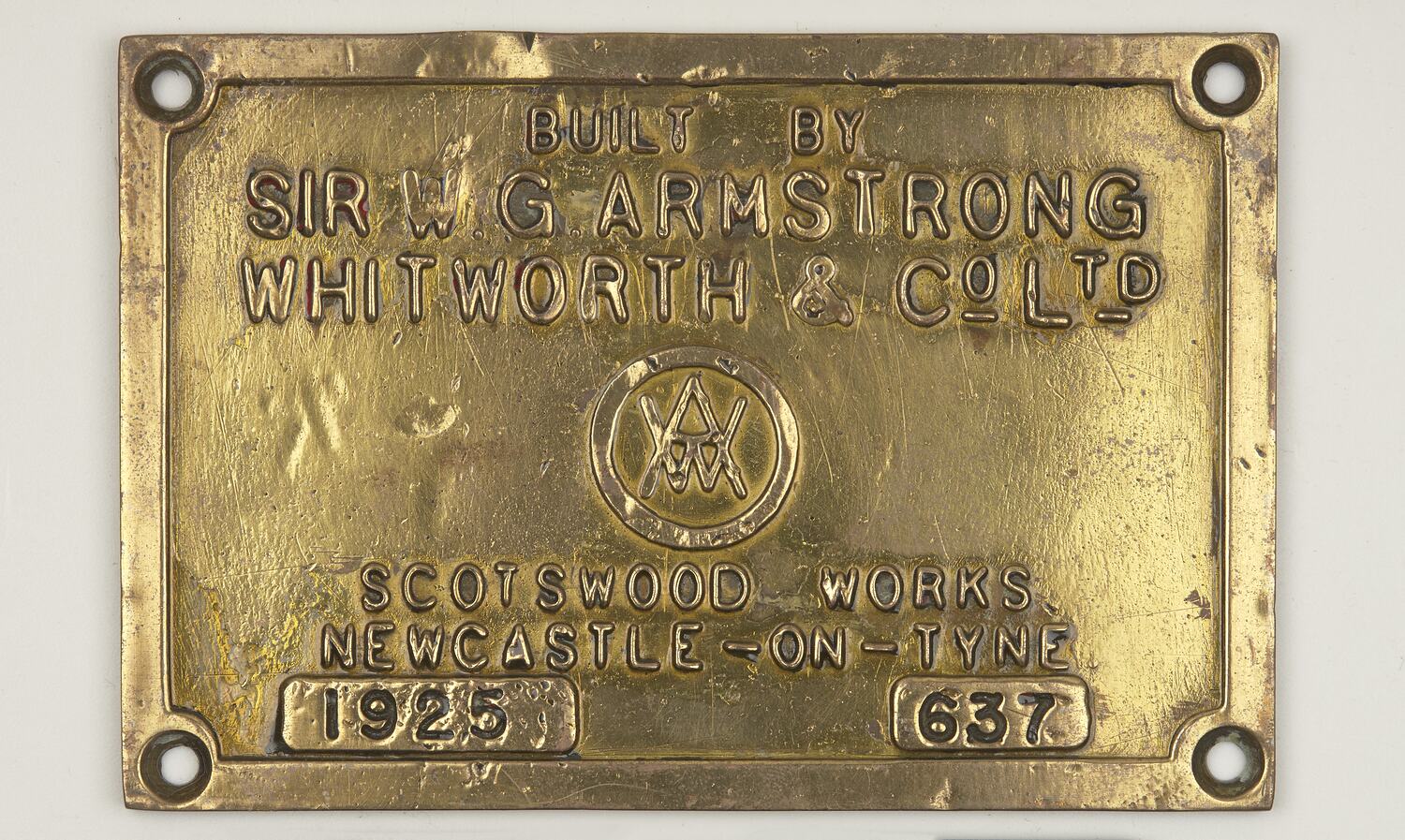 Brass rectangular locomotive builders plate, No. 637, manufactured by Sir W. G. Armstrong Whitworth & Co Ltd, Scotswood Works, Newcastle on Tyne in 1925.
