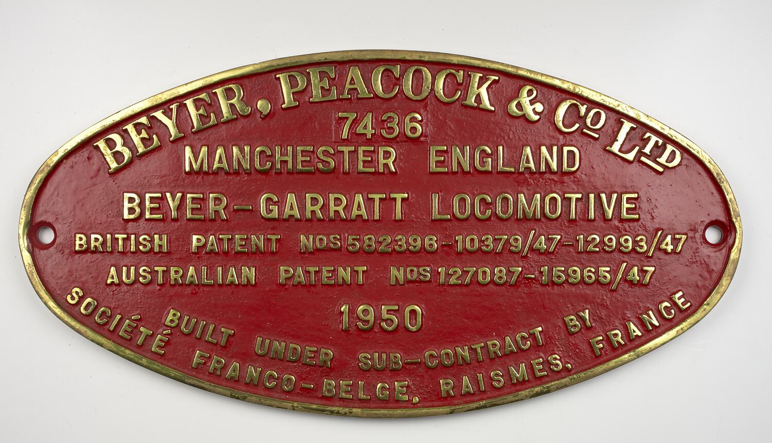 Brass oval locomotive builders plate, No. 7436, manufactured by Société Franco-Belge in Raismes, France under sub-contract for Beyer Peacock & Co. Ltd., Manchester in 1950.