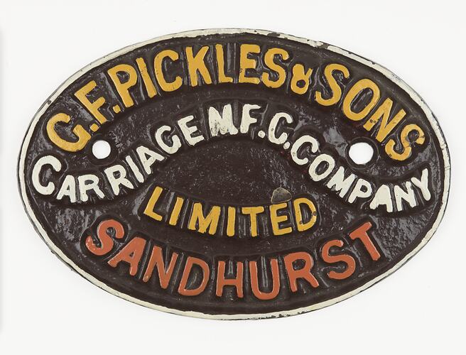 Builders plate for railway rollingstock, made by G.F. Pickles & Sons, Sandhurst.