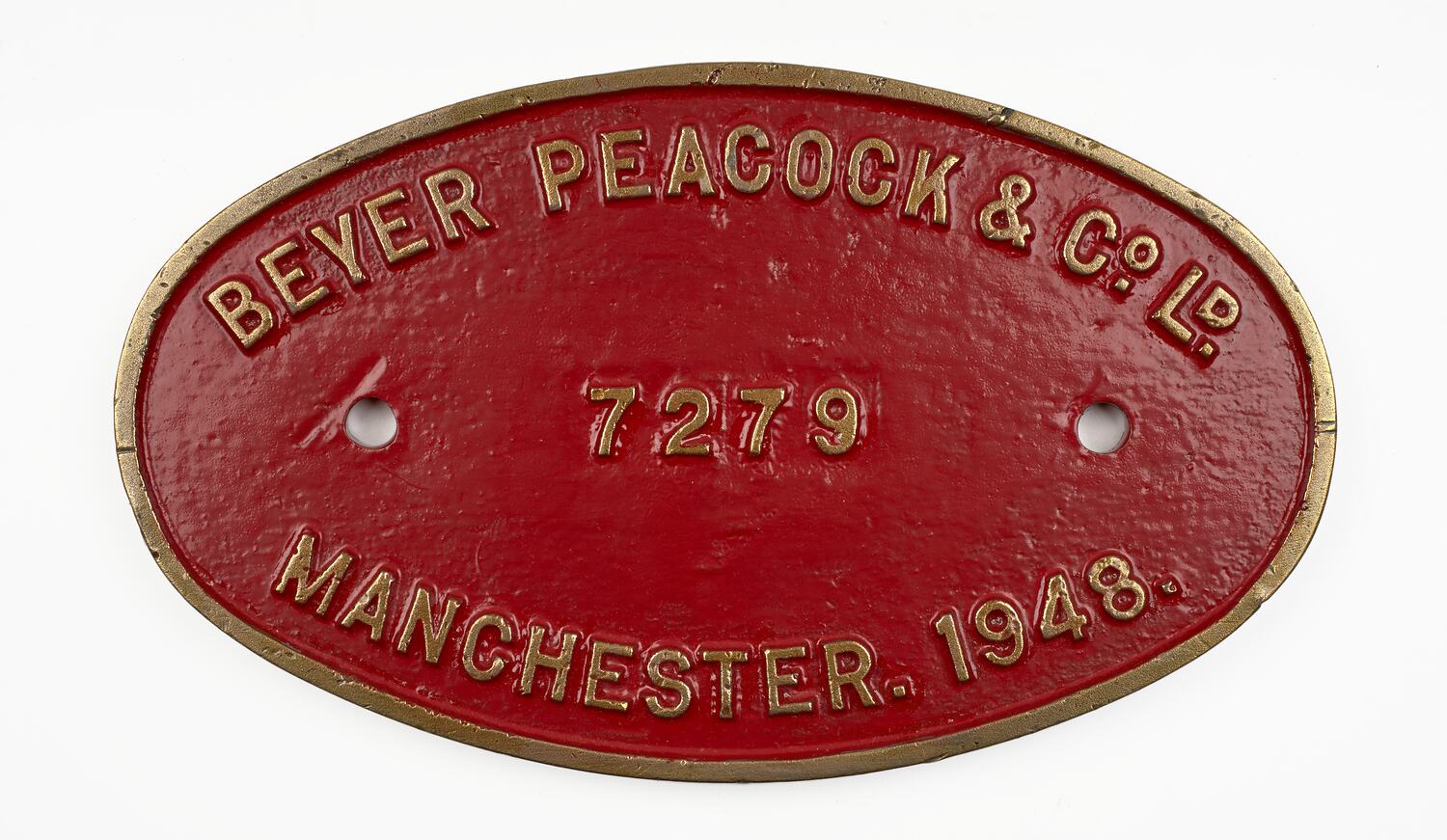 Brass oval locomotive builders plate, No. 7279, manufactured by Beyer Peacock & Co. Ltd., Manchester in 1948.
