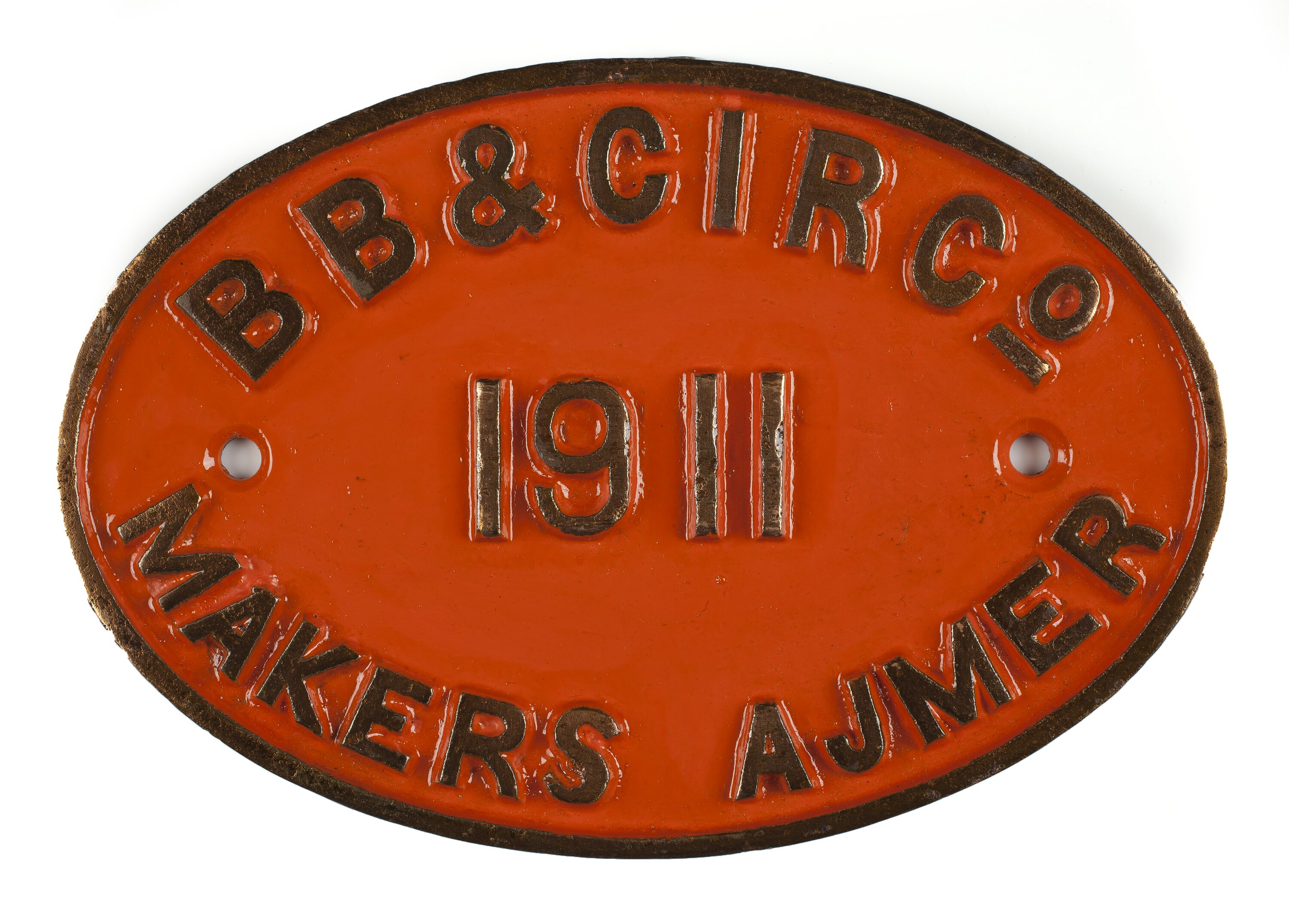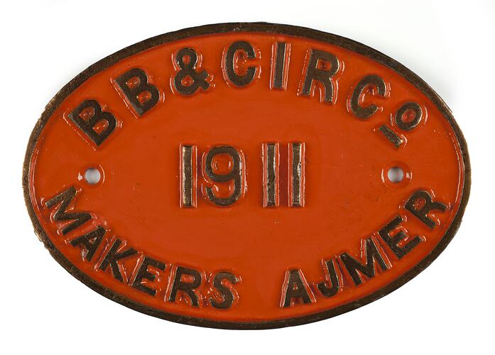 Brass oval locomotive builders plate, manufactured by Bombay, Baroda & Central Indian Railway Workshops, Ajmer, India in 1911.