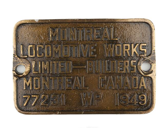 Brass rectangular locomotive builders plate, No. 77231, manufactured by Montreal Locomotive Works Limited, Montreal, Canada, 1949.