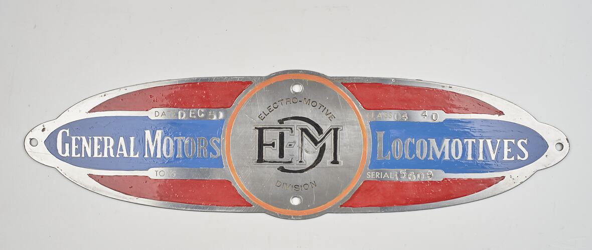 Stainless steel oval locomotive builders plate, manufactured by General Motors, Electro-Motive Division, Illinois, USA in 1951.