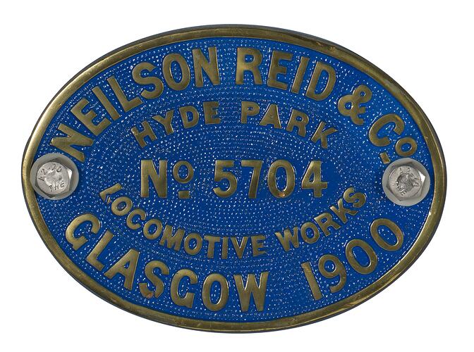 Brass oval locomotive builders plate, No. 5704, manufactured by Neilson Reid & Co., Hyde Park Locomotive Works, Glasgow, 1900.