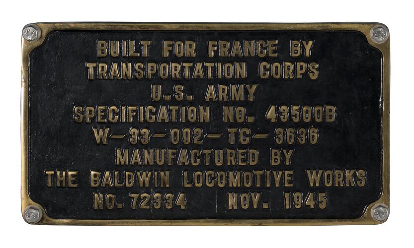 Brass rectangular locomotive builders plate, No. 72334, manufactured by Baldwin Locomotive Works, Philadelphia, Pennsylvania, November 1945. Commissioned by the United States Army Transportation Corps for use in France.