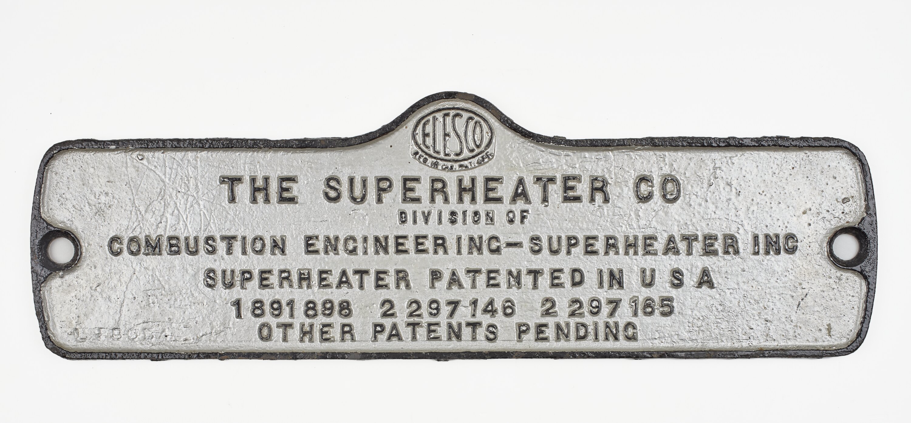 Cast iron badge locomotive builders plate, manufactured by The Superheater Co. Ltd, United States of America, circa 1952.