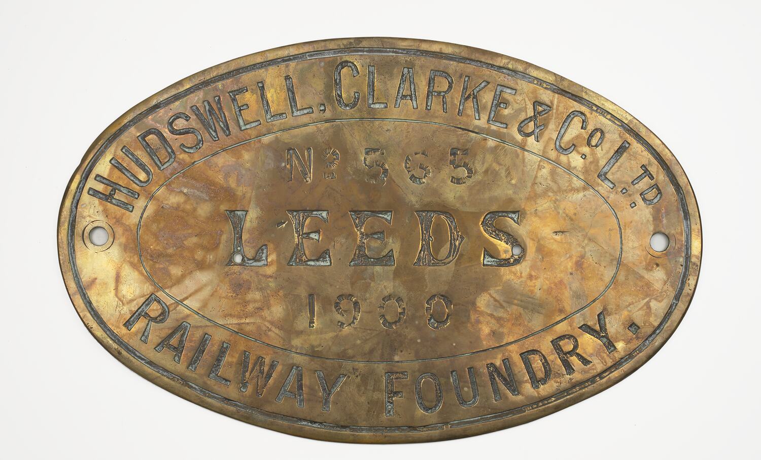 Brass oval locomotive builders plate, No. 565, manufactured by Hudswell, Clarke & Co., Leeds, England, 1900.