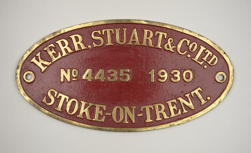 Brass oval locomotive builders plate, No. 4435, manufactured by Kerr Stuart & Co. Ltd, Stoke-on-Trent, England, 1930.