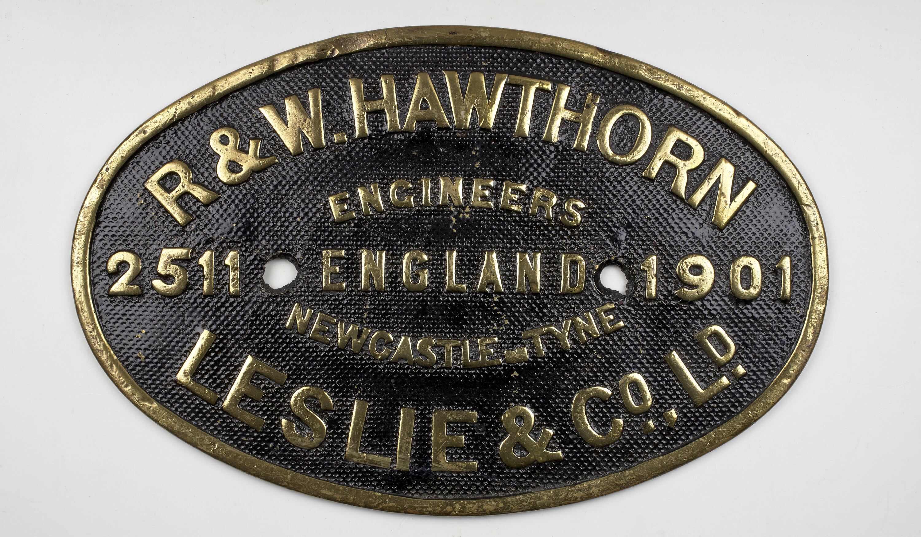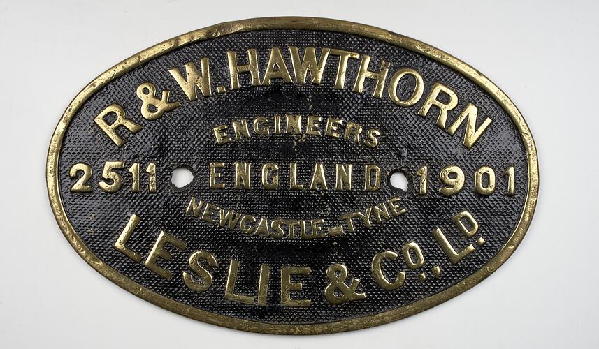 Brass oval locomotive builders plate, No. 2511, manufactured by R. & W. Hawthorn Leslie & Co. Ltd, Newcastle-upon-Tyne, England, 1901.