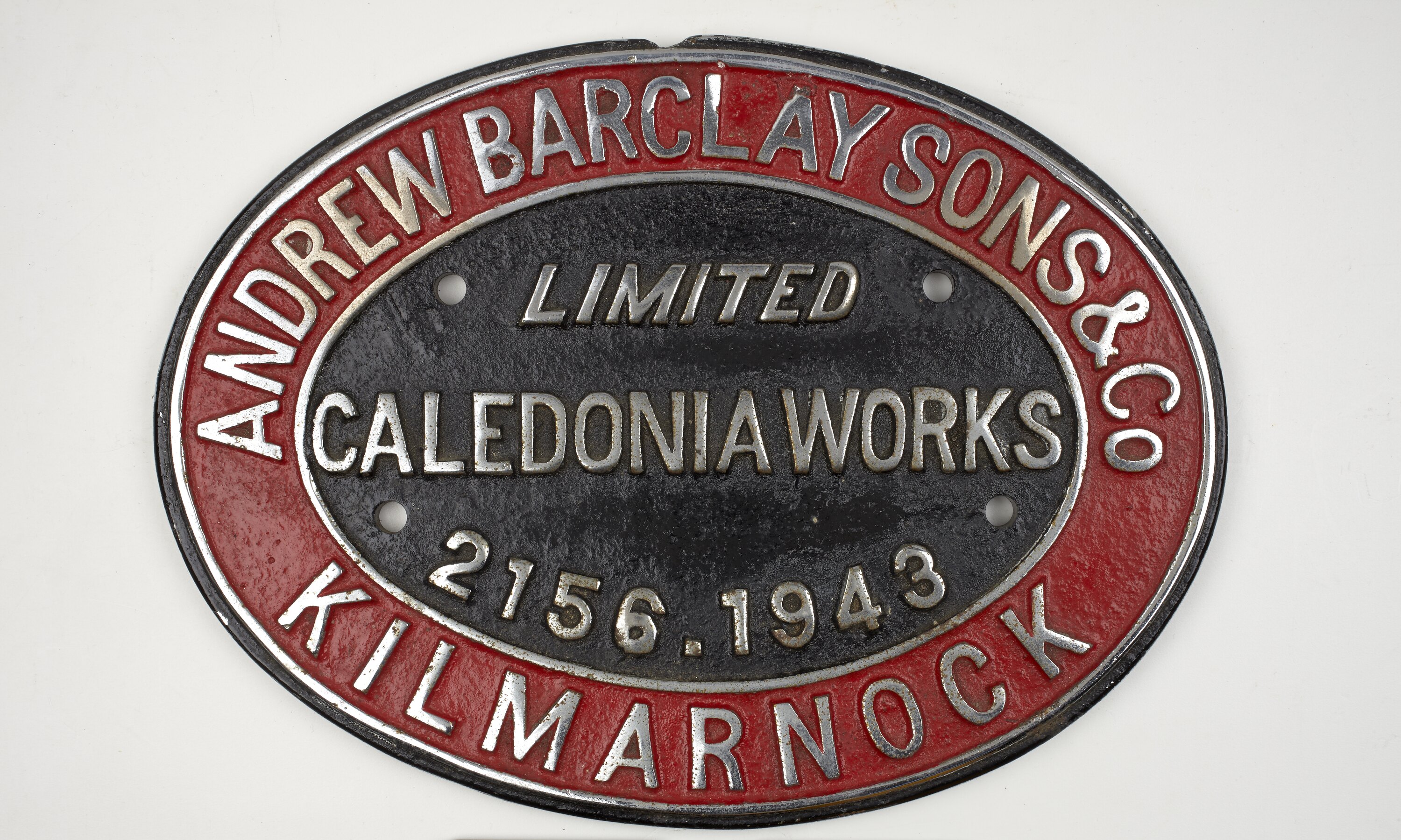 Cast iron oval locomotive builders plate, No. 2156, manufactured by Andrew Barclay Sons & Co. Ltd, Caledonia Works, Kilmarnock in 1943.