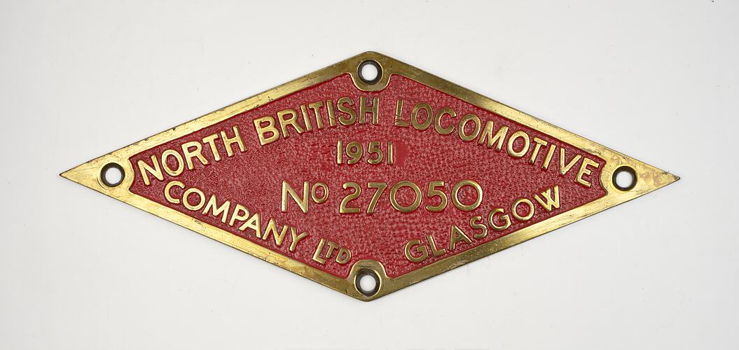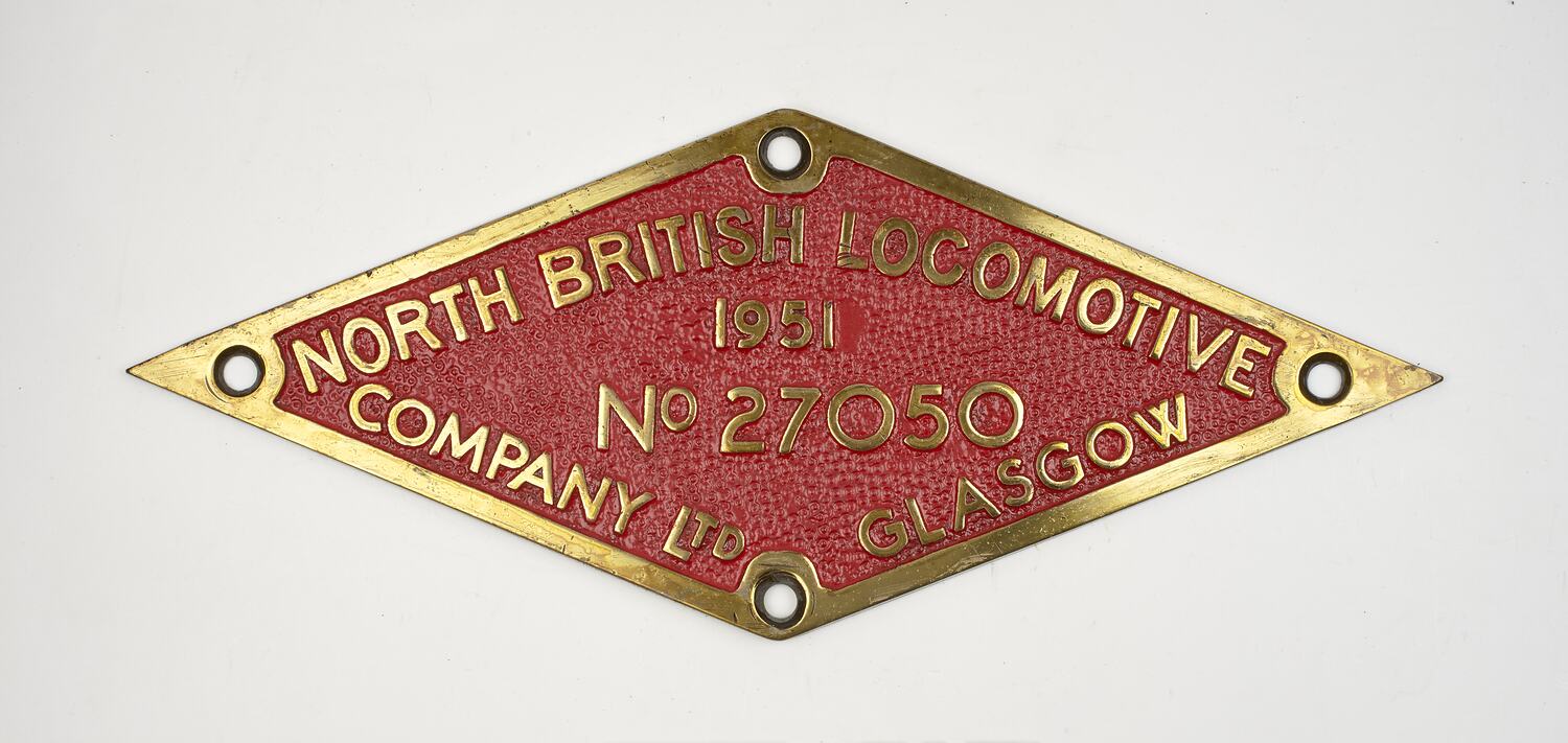 Brass diamond shaped locomotive builders plate, No. 27050, manufactured by North British Locomotive Co., Glasgow, Scotland, 1951.