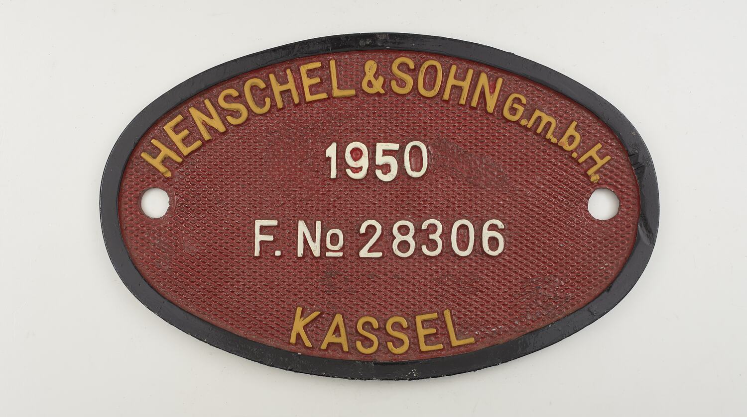 Brass oval locomotive builders plate, No. 28306, manufactured by Henschel & Sohn, Kassel, Hesse, Germany, in 1950.