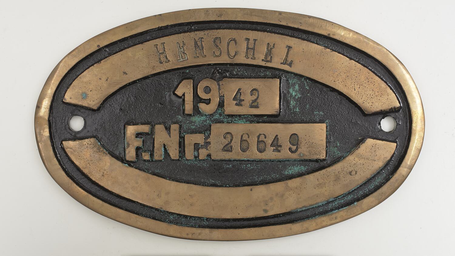 Brass oval locomotive builders plate, No. 26649, manufactured by Henschel & Sohn, Kassel, Hesse, Germany, in 1942.