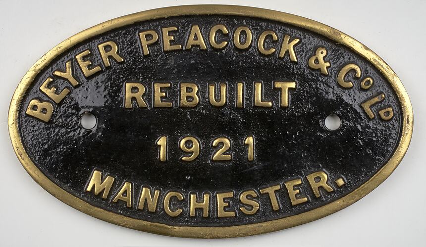 Brass oval locomotive builders plate, manufactured by Beyer Peacock & Co. Ltd., Manchester in 1921.