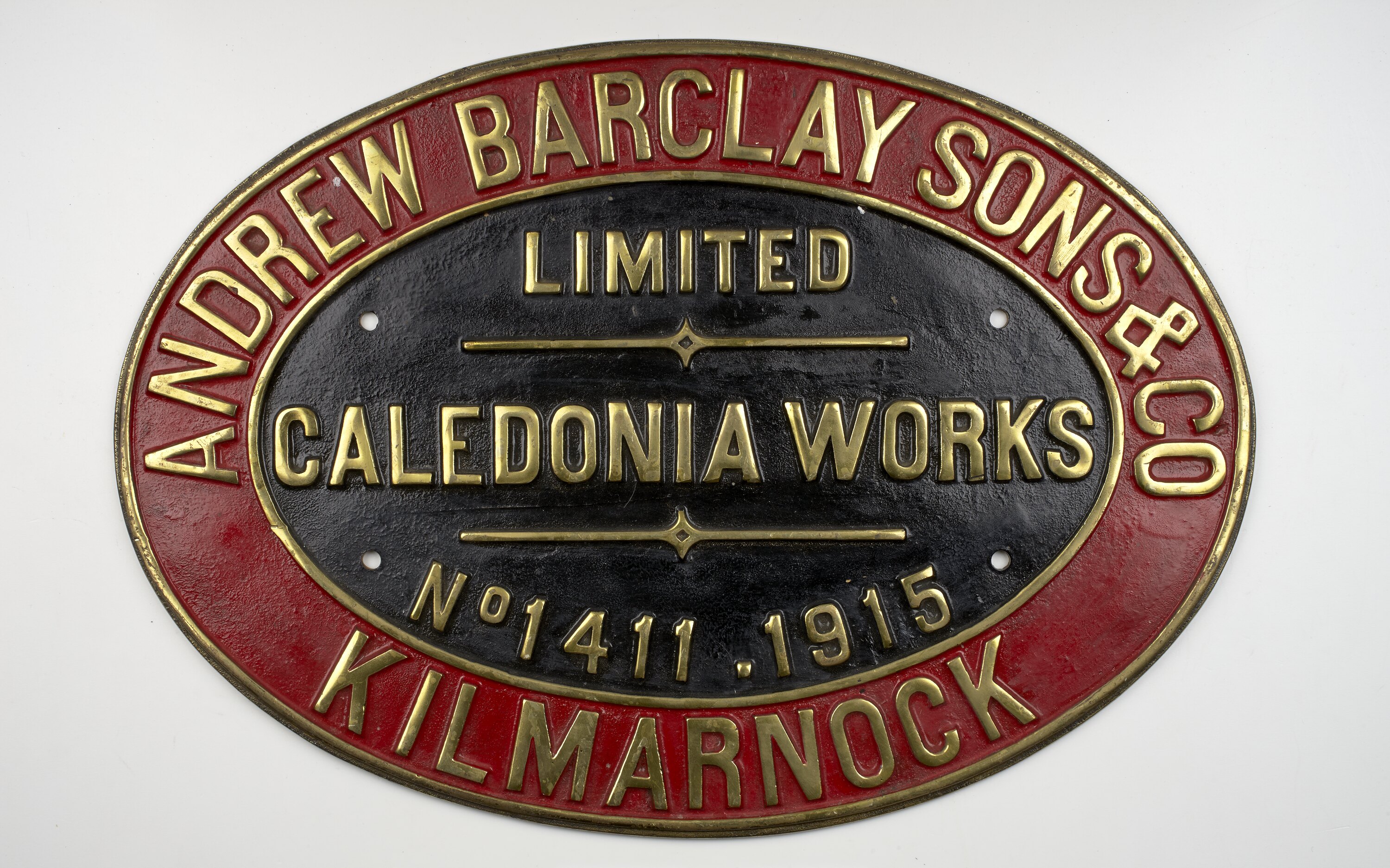Cast iron oval locomotive builders plate, No. 1411, manufactured by Andrew Barclay Sons & Co. Ltd, Caledonia Works, Kilmarnock in 1915.