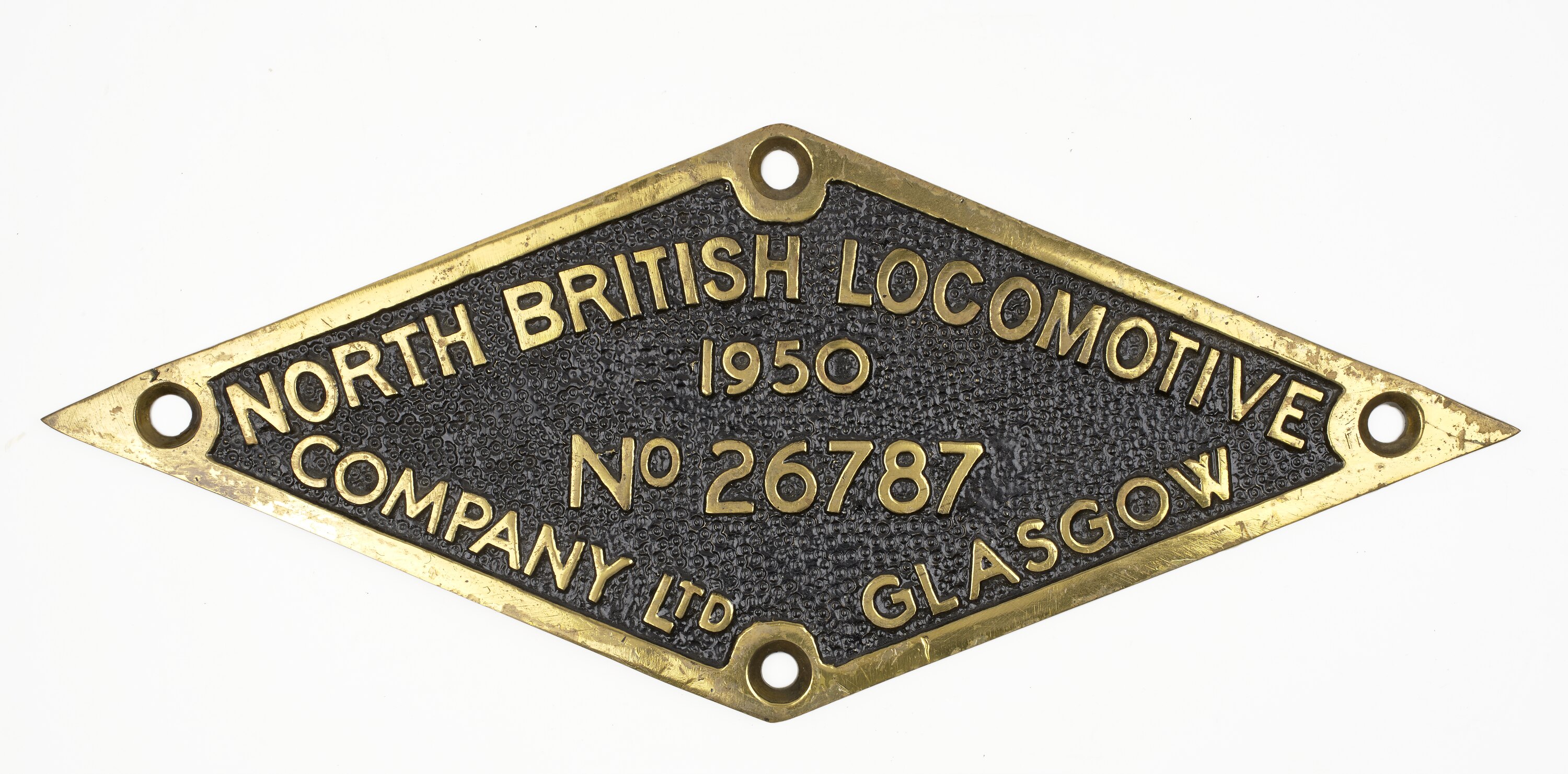 Brass diamond shaped locomotive builders plate, No. 26787, manufactured by North British Locomotive Co., Glasgow, Scotland, 1950.
